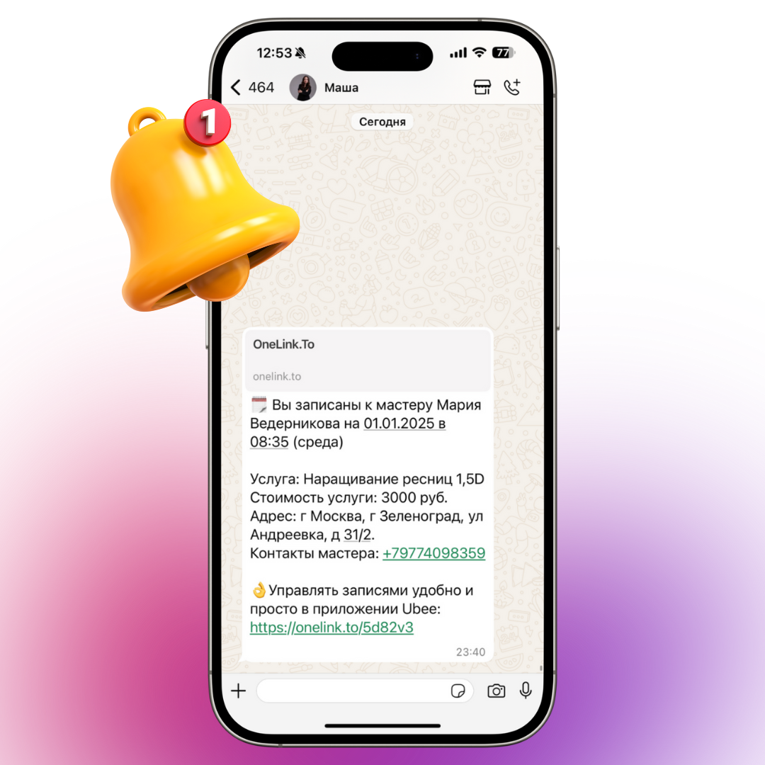 Одной из самых больших проблем в работе мастеров являются забытые записи или опоздания клиентов. Чтобы этого избежать, приложение Ubee отправляет автоматические уведомления через WhatsApp. Ubee - единственный сервис, который предлагает данный сервис совершенно бесплатно для мастера.